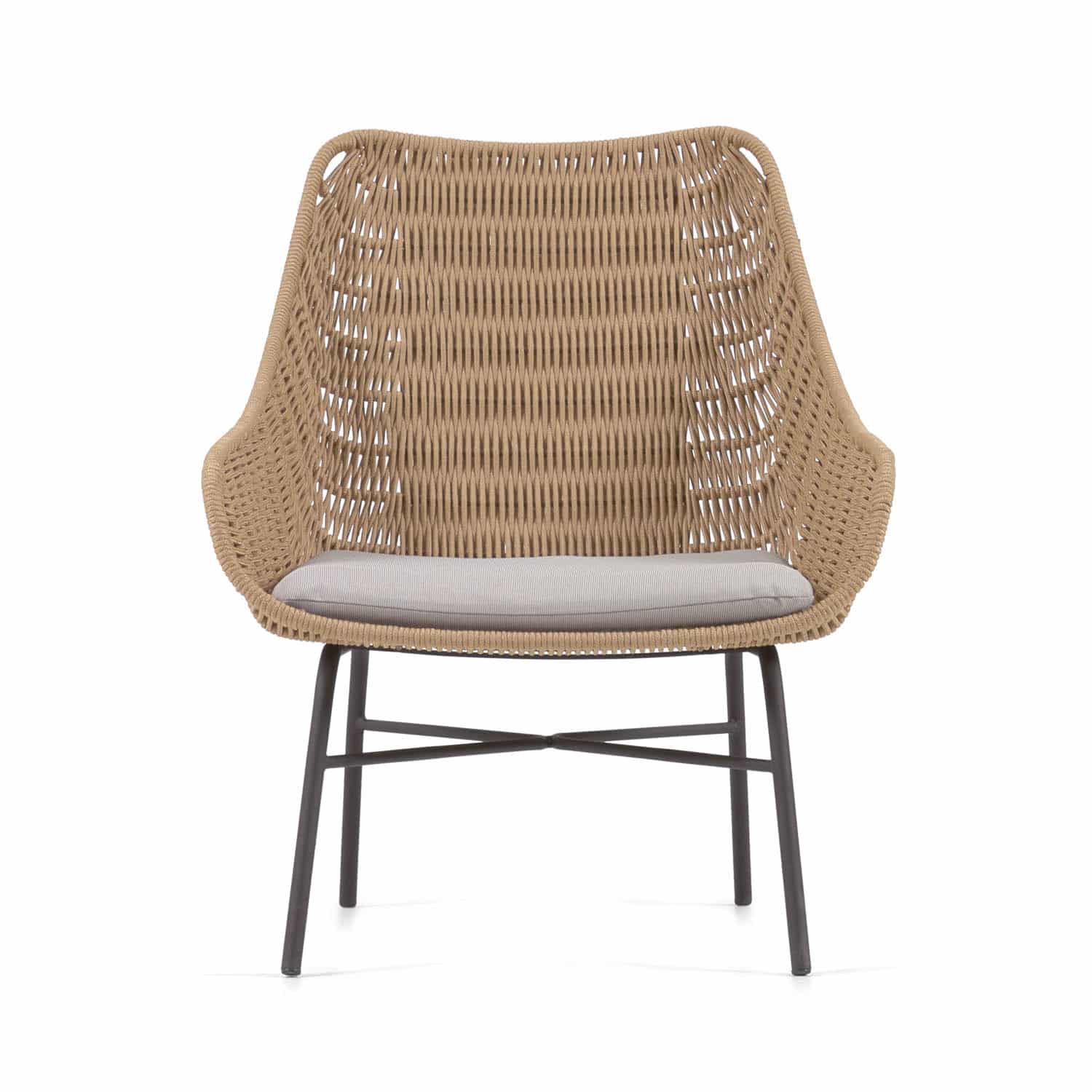 Denne Abeli lænestol med armlæn fra Kave Home lægger op til behagelig afslapning. Stolen er lavet af beige reb og designet med en stofhynde og stilfulde ben i galvaniseret stål. En stol, der både kan bruges indendørs som lænestol og som havestol i overdæ